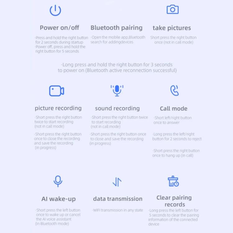 1. 1080P HD video + 8-megapixel photography 2. AI image recognition + voice broadcast 3. Multi-modal AI conversation, built-in ChatGPT, DeepSeek, and other large models 4. AI voice office assistant, simultaneous interpretation, voice transcription, and meeting management 5. Open Hi-Fi Bluetooth audio, stereo sound, and comfortable wearing 6. WiFi + Bluetooth 5.3 connectivity for high-speed transfers 7. ENC intelligent noise reduction for clear calls 8. Built-in 32GB storage 9. 230mAh battery, 7 hours of audio life 10. Operation: Touch + button